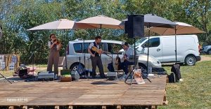 commencent leur concert. Ils interprètent des airs de musique irlandaise. Le repas continue sur ce rythme là, les visiteurs sont assis à l’ombre sous le chapiteau mis en place par l’organisation et y restent vue la chaleur accablante à l’extérieur. Le groupe Isybush rejoue 3 fois dans l’après-midi pour permettre aux visiteurs de les découvrir.
