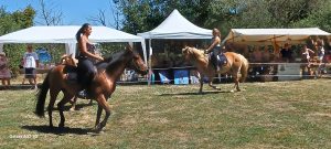 poneys. Gaëlle, Dora, Méloë entrent en scène par un balai des poneys. Puis c’est un moment, au cours duquel Méloë nous montre le résultat du travail de dressage d’un poney, qui lui obéit au doigt et à l’œil. Une scénette sur la musique de Mickael Jakson ravit les spectateurs. Ce spectacle est très apprécié des visiteurs qui applaudissent à chaque fin de scénette.  Beaucoup aurait souhaité que cette animation se prolonge. Un grand bravo aux actrices de cette animation.